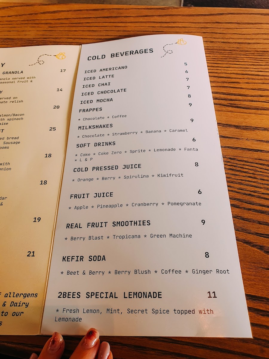 The café excels in beverages too, offering refreshing choices like the Iced Americano and their signature 2bees Special Lemonade.